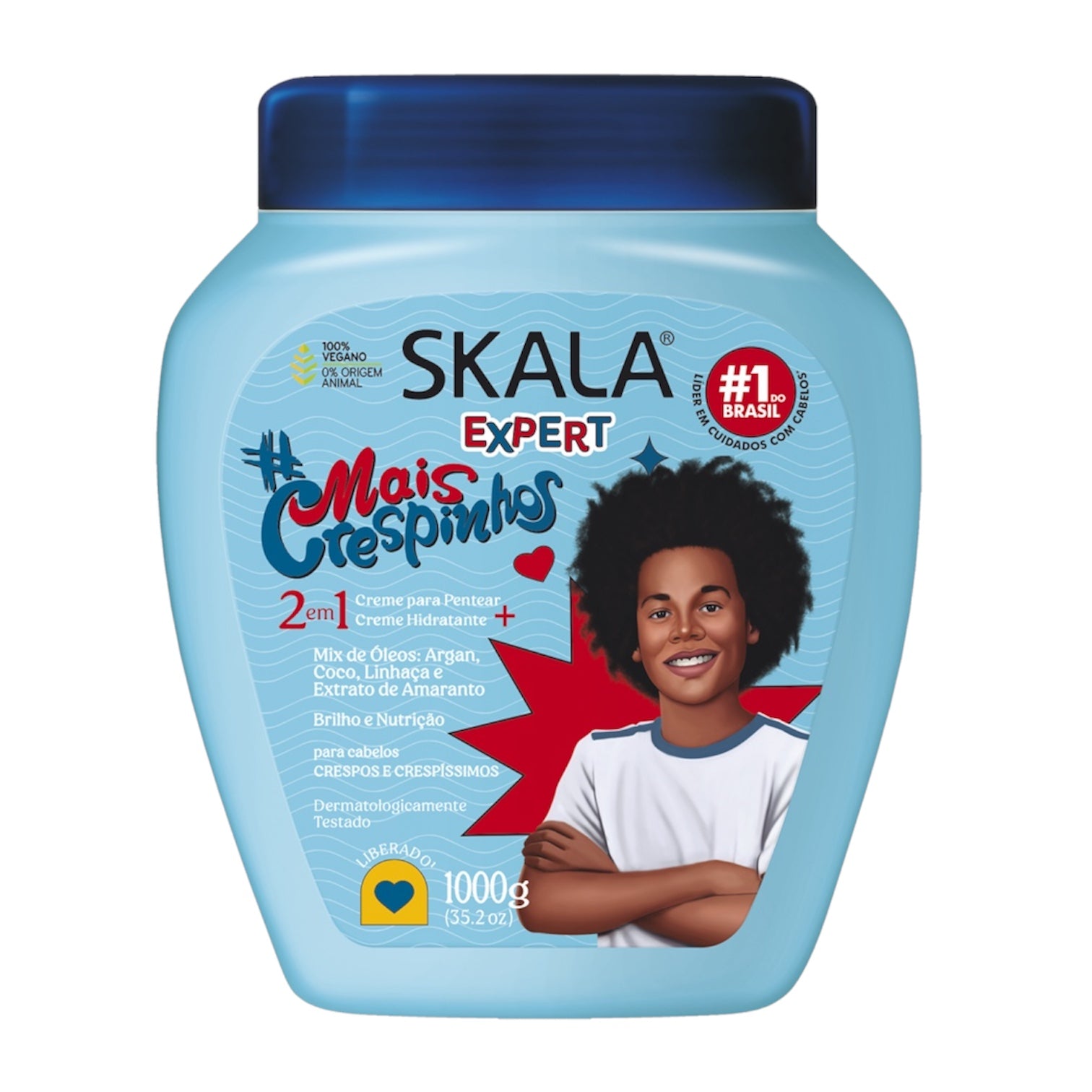 Soy un tratamiento 2 en 1 cargado de nutrientes y vitaminas para cuidar el pelo afro y crespo de los niños. Soy ultra nutritiva e hidratante, ideal para darle vida al pelo seco, aportar mucho brillo, controlar el frizz y revitalizar. Tengo manteca de karité, aceite de argán, aceite de coco, aceite de semilla de lino y extracto de amaranto. No tengo sulfatos, parabenos, petrolatos, siliconas ni aceite mineral y soy dermatológicamente probado.