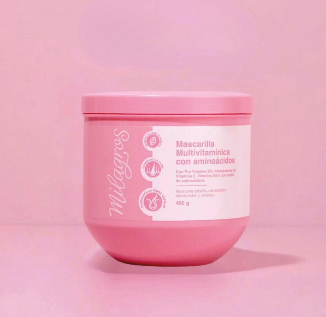 La Mascarilla capilar multivitamínica Milagros es un verdadero coctel para tu cabello. Es la solución ideal para cabellos alisados, decolorados y dañados, ya que no solo detiene la caída, sino que también fortalece la fibra capilar. Enriquecida con vitamina B5 y microesferas de vitamina E, esta mascarilla ofrece una nutrición profunda y revitalizante para un cabello más saludable y vibrante.