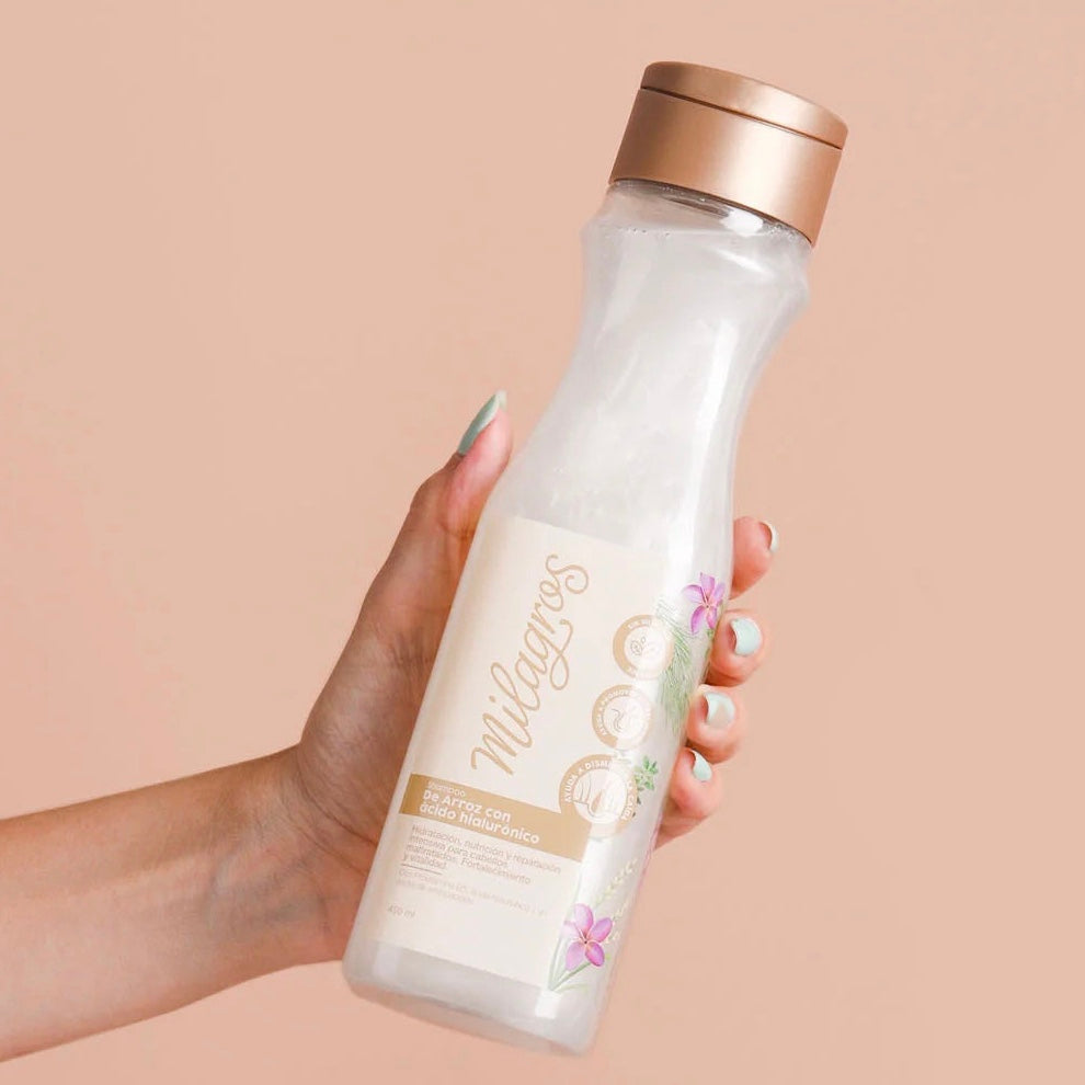 Reparación total para un cabello sano El Shampoo Milagros arroz y ácido hialurónico de 450ml es una verdadera fuente de hidratación, nutrición y reparación para cabellos maltratados. Libre de parabenos, siliconas y sal, este shampoo promueve el crecimiento capilar, disminuye la caída y brinda una intensa reparación.